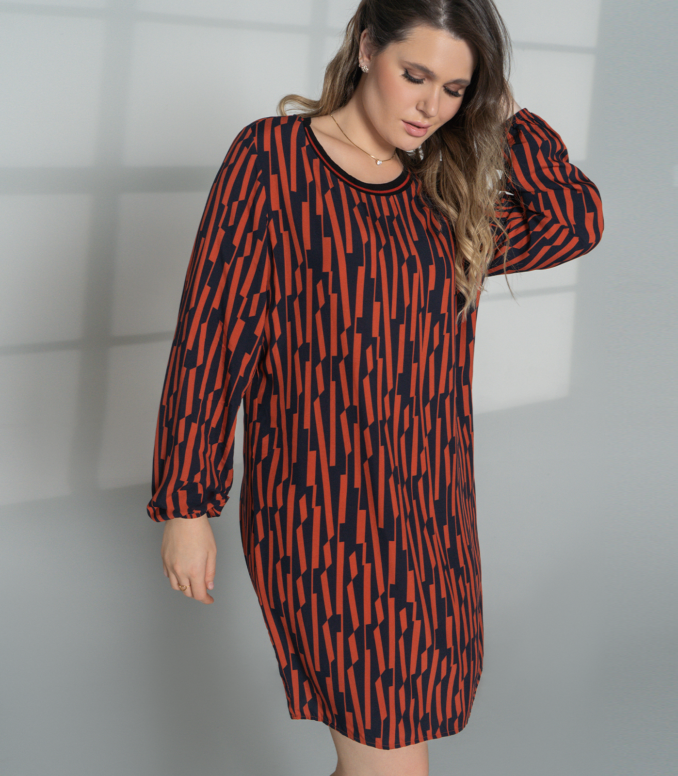 Destaque-se com o novo vestido com listras de Viscose Khyara manga longa Terracota e Preto. Com combinação de cores elegantes, listras verticais e manga longa é uma peça moderna, confortável e versátil para qualquer ocasião.