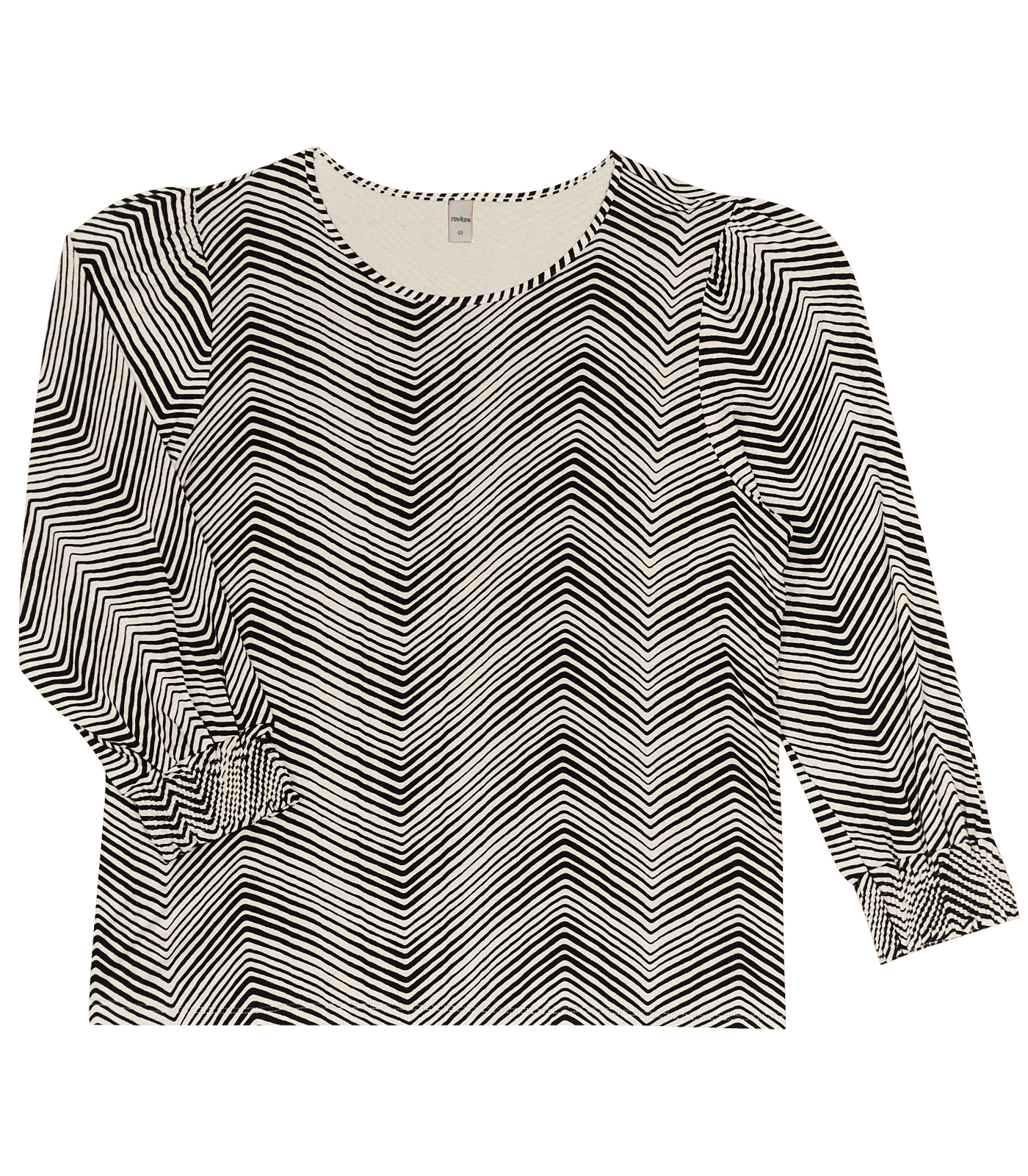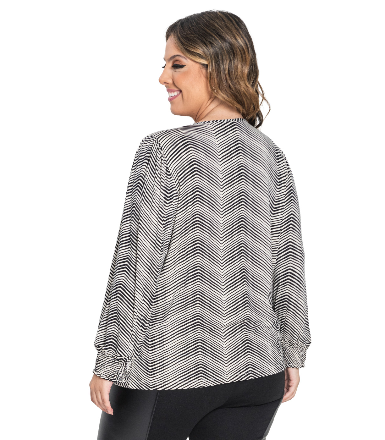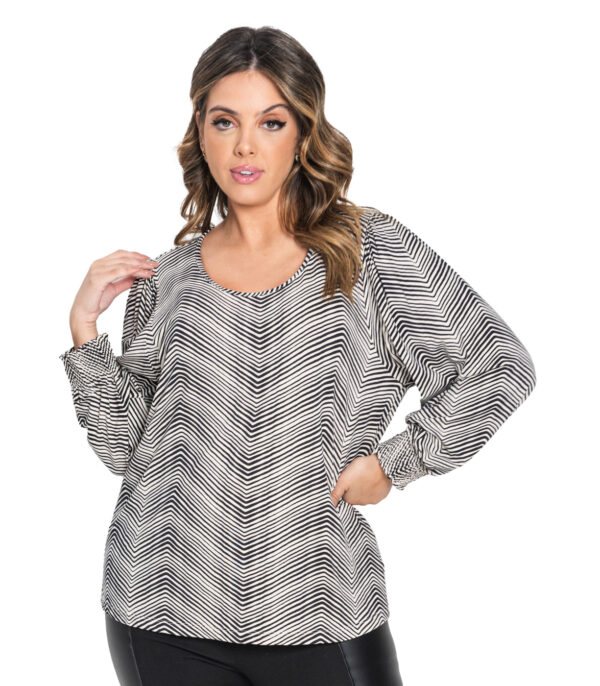 Blusa de malha viscotorcion creme, linhas horizontais geométricas, manga 7/8, moderna e versátil, matéria-prima de qualidade, ideal para looks diários e despojados, visual moderno e casual.