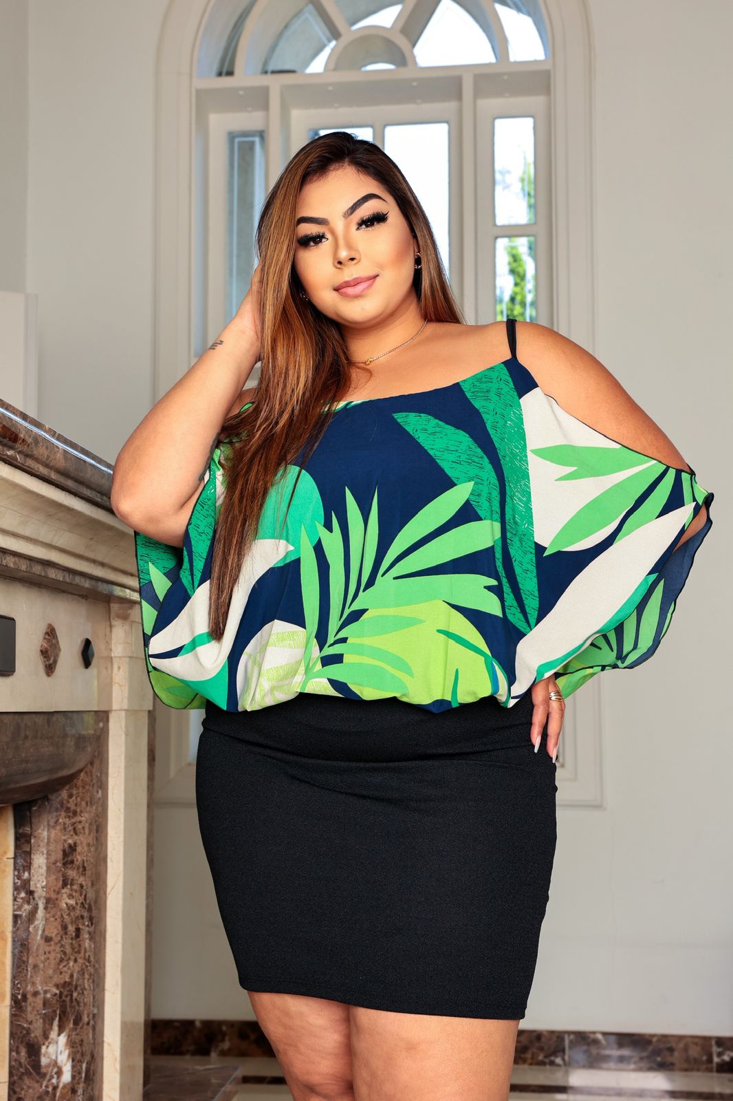 Blusa Morcego Azul Floral com Verde – ModaLu